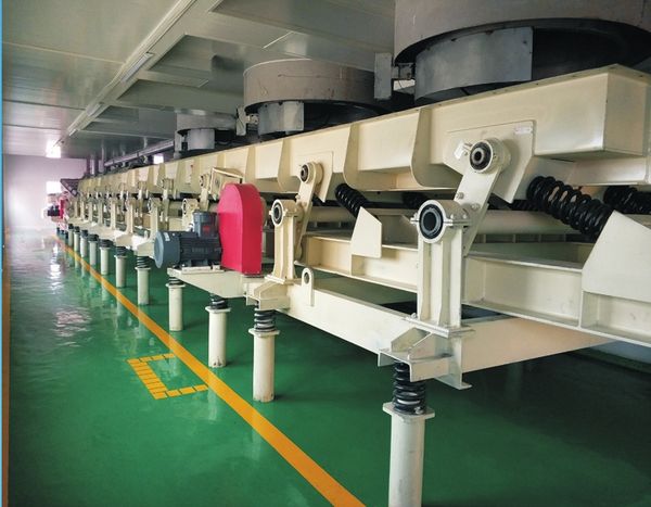 平衡型輸送機,通過電機的曲柄運動和彈簧的共振運動使上下槽體振動,可以完成輸送、烘干、冷卻、剝離、篩選、脫水、定向和多點分配; 輸送槽體寬度從 150毫米到 2米不等,長度可達 30米。